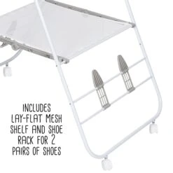 - Includes lay-flat mesh shelf and shoe rack for 2 pairs of shoes