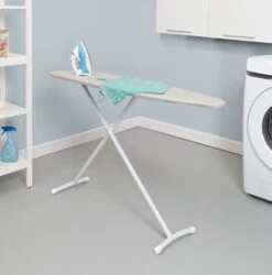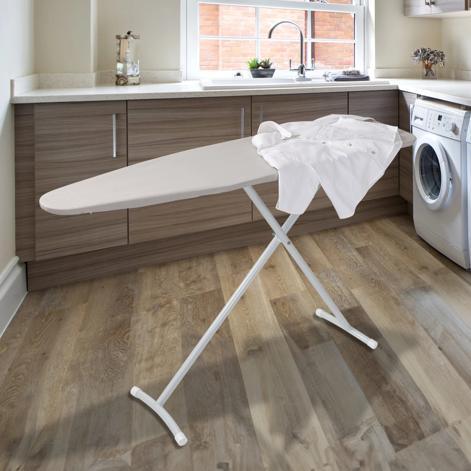 Achieve perfectly pressed clothes with our T-Leg Ironing Board. This ironing board offers a stable and durable ironing surface thanks to its sturdy T-leg design, ensuring balance on any floor type. Its spacious 53 x 13-inch surface is ideal for ironing all garment sizes, from delicate shirts to larger items like linens and tablecloths.