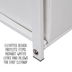 - Elevated design protects items against water leaks and allows for easy cleanup