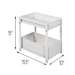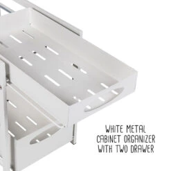 Say goodbye to avalanches when you open your cupboards, and hello to modern and simple organization! This white metal cabinet organizer features clean lines, a crisp white finish, and two pull-out drawers. Taller items like cleaning supplies and hair products will feel right at home in the bottom drawer. In contrast, the top drawer makes organizing sponges, facecloths, and other smaller items a cinch. Additionally, when used as an under sink organizer, the footed design will keep your items elevated—protecting them from any puddles due to water leaks. This cabinet storage solution offers durability, stability, and lasting beauty.