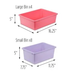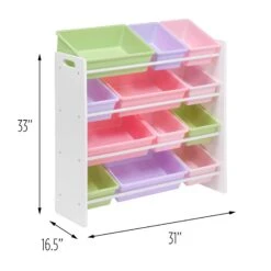 - Organize a playroom’s worth of toys in 12 plastic bins across four tiers