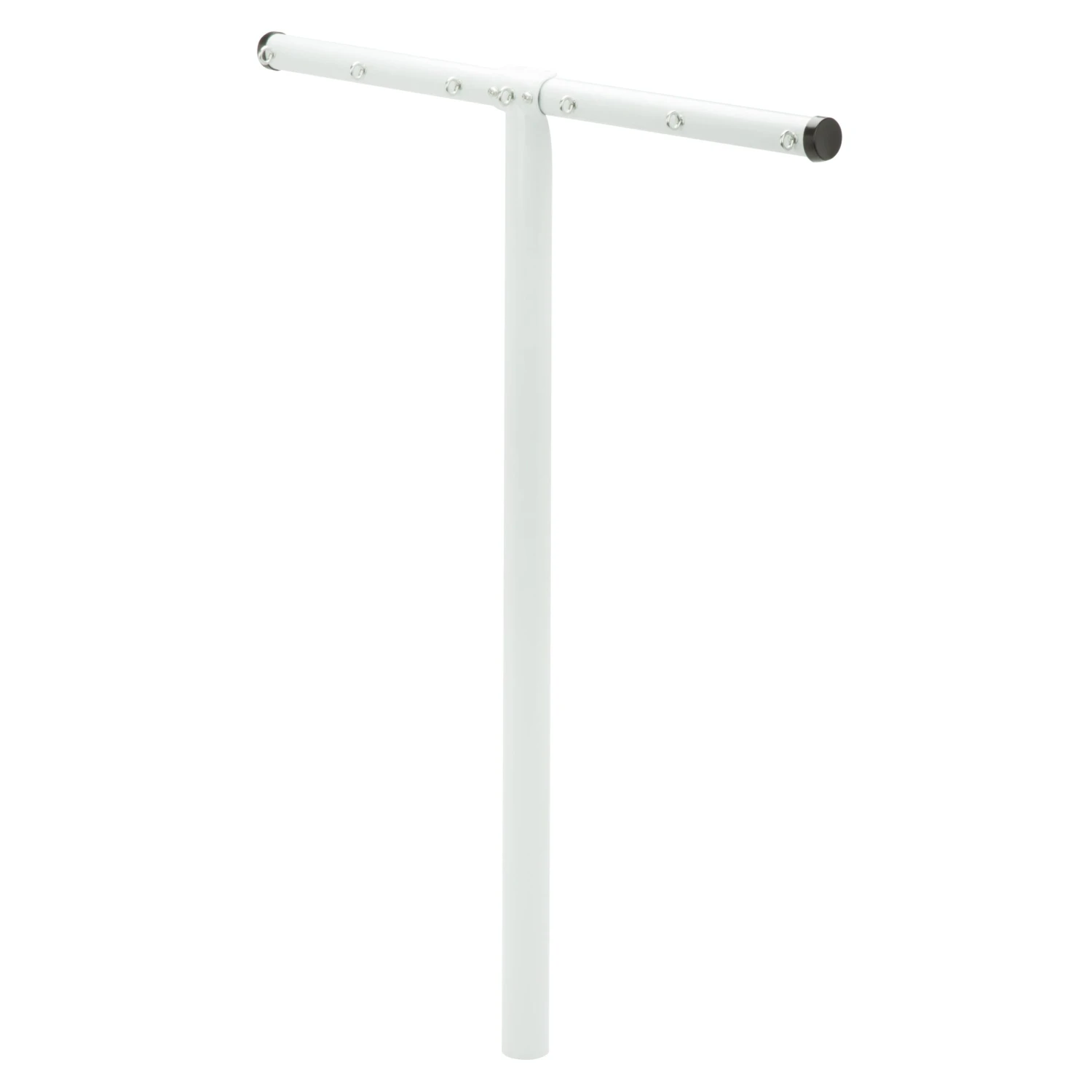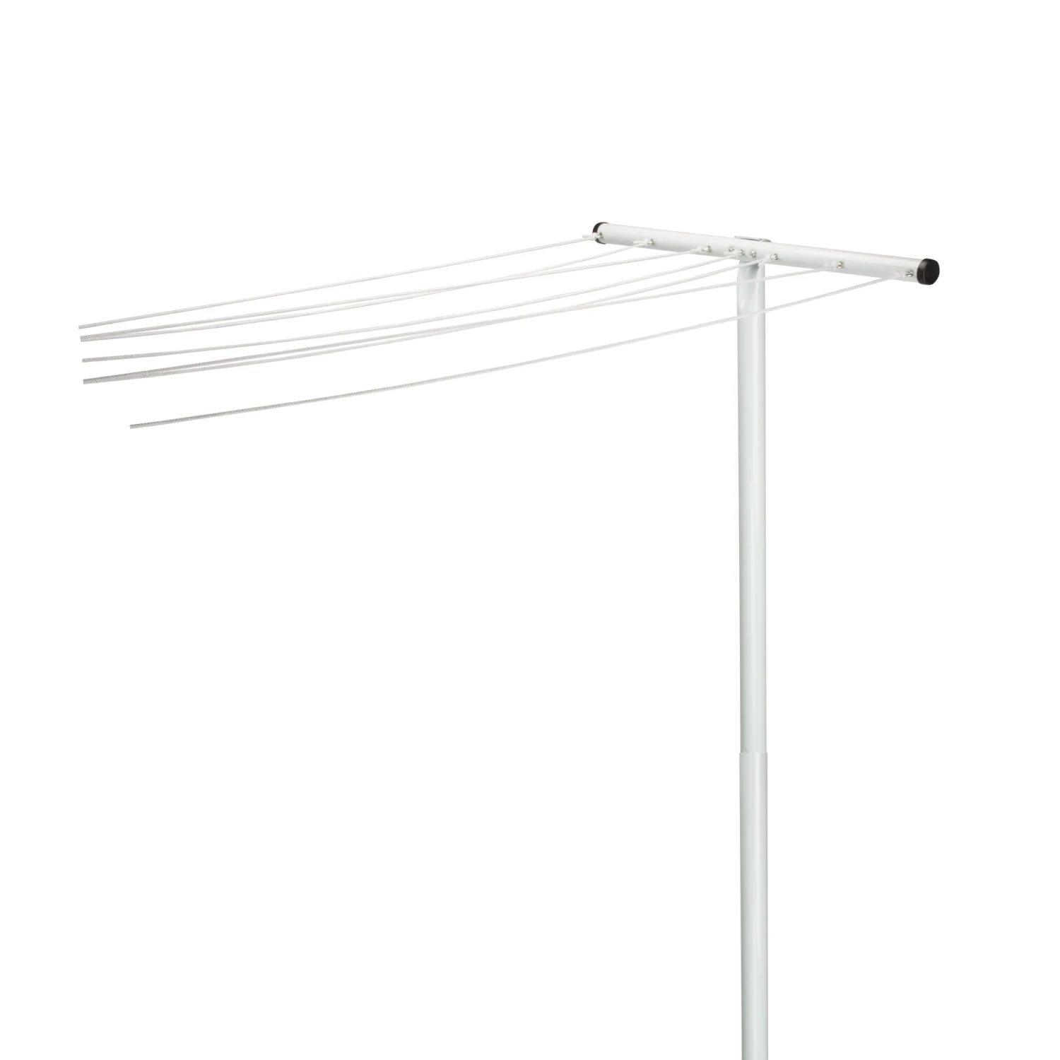 This powder-coated steel outdoor drying T-post is durable and rust-resistant and features seven lines for drying clothes. Permanently installed, the 2-inch diameter post provides stability for heavy loads and strength against the elements. Attach up to 7 lines to the substantial 32-inch cross arm. Embed in cement to install post; string your clothesline; knot and tighten with the included eyehooks and it’s ready for use. Designed for post-to-wall installation; attach two or more T-posts for a free standing system.